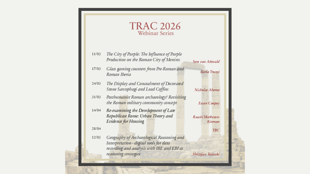 Current Season – 2026 admin, March 3, 2026March 11, 2026 TRAC would like to welcome you to our 2026 webinar series. Register for free for each speaking event on the ticketsource links below. 11/03/2026 – 18:00 GMT – The City of Purple: The Influence of Purple Production on the Roman City of Meninx Sem Van Atteveld, Leiden University This study discusses the impact that the murex-purple industry had on the Roman city of Meninx, located on Djerba, Tunisia. Mattingly’s seminal model of the Roman urban economy argues that cities could occupy significant positions within their regional economies; however, focused case studies demonstrating this influence have remained limited. By taking Meninx as a case study, Sam aims to show just how influential a city dominated by the murex-purple industry could be within its local economic landscape. Sem van Atteveld holds an MA in Ancient History from the University of Leiden, where he specialised in the functioning and impact of Roman luxury material culture. His ongoing research focuses on the production and local economic impact of murex purple in the Roman world, as well as the evolving use of porphyry as a secondary agent.REGISTER AT https://www.ticketsource.co.uk/theoretical-roman-archaeology-conference/t-aaaazlm 17/03/2026 – 17:00 GMT – Glass gaming counters from Pre-Roman and Roman Iberia Ilaria Truzzi, University of Reading The study of games is about much more than just entertainment: games can shed light on social interactions, provide strategic or educational experiences, and reflect beliefs related to chance and divination. Examining differences in games played by children and adults, men and women, or elites and sub-elites can therefore offer valuable insights into social life in the past. Iberia is a unique case-study region, home to many civilizations—Greeks, Carthaginians, Celtiberians, Iberians, and Romans. The cultural diversity these populations brought to the Iberian Peninsula is why this region represents a distinctive setting of intercultural interaction, making it a promising context for uncovering new information about multicultural exchange and cohabitation in the past. Ilaria Truzzi is a 2nd year PhD student in the department of Classics at the university of Reading. She owns a bachelor’s and a master’s degrees in Archaeology, and she is an expert in gaming studies in Antiquity. She is involved in several projects on gaming such as the Gametable COST Action ‘Computational Techniques for TableTop games heritage’ which is a European project that aims to interrogate the use of AI for the understanding of the rules and the playability of ancient games. She is involved in the GameInLab granted project ‘Play and the city: investigating the cultural heritage of games of the City of Rome’, to which she is working as a research assistant for setting up a QGIS database of the findspots of graffiti gaming boards within the Servian Walls in Rome. She also is a member of the organizing committee of the Board Games Studies Colloquium, a series of conference totally dedicated to gaming studies, that is coming to its 28th edition in 2026.REGISTER AT https://www.ticketsource.co.uk/theoretical-roman-archaeology-conference/t-mjjjezl 24/03/2026 – 17:00 GMT – The Display and Concealment of Decorated Stone Sarcophagi and Lead Coffins Nicholas Aherne, University of Groningen During the funeral in the Roman world, the deceased would often become replaced by the image of a burial receptacle, but in some cases this new form of protection and commemoration was only temporarily visible. Ornately decorated lead coffins produced in Roman Phoenicia were concealed from the view of the living after the funeral. Whilst this partly reflects a practice of conspicuous consumption, through their materiality and decoration how did these coffins nonetheless come to shape sensorial experiences? In this paper, I investigate this line of questioning, as raised by a hypogeum nestled in the hinterland of Roman Tyre; it has yielded 29 lead coffins as well as four stone sarcophagi, four wooden coffins, and a single terracotta coffin. This paper explores how such receptacles stimulated emotional, contemplative, and bodily responses amongst the living as they navigated the new boundaries of their relationship with the dead. More specifically, I propose that the lead coffins created a series of material and visual boundaries between the two worlds, their effects supplemented and enhanced by their wider visuo-spatial context: tomb decoration, visible sarcophagi, and grave goods. The lead coffins were operating in somewhat different ways to their stone counterparts: magickal material properties of lead were combined with a distinct iconographic programme centred on replicative and boundary-enforcing themes which could symbolically shield the dead from potential violators, unwanted reusers, and malignant forces, as well as console mourners. More broadly, this paper highlights a region often sidelined in theoretical Roman archaeology. By shifting attention from the well-studied stone sarcophagi of Rome this paper contributes novel perspectives on funerary experiences in the Roman world. Furthermore, the paper reveals the artistic ingenuity of Tyrian workshops and their networks with craftsmen in other regions which helps elucidate wider cross-cultural funerary customs.REGISTER AT https://www.ticketsource.co.uk/theoretical-roman-archaeology-conference/t-dkkkjqv 31/03/2026 – 17:00 BST – Posthumanist Roman archaeology? Revisiting the Roman military community concept Dr Ewan Coopey, Macquarie University Since the 1990s, the field of Roman military studies has significantly expanded its scope, embracing more critical questions, theoretical approaches, and collaborative methodologies. Central to this expansion has been the concept of ‘the Roman military community’ and its emphasis on the lives of those in and around Rome’s armies. This seminar rev